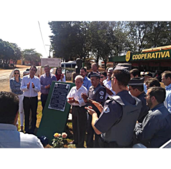 Segundo da esquerda para direita: prefeito Sergio Fornasier, ao lado o vice prefeito Antonio Marcos Vallone, do lado direito da placa o Sr. Franco Di Nallo presidente da CAP - COOPERATIVA DE PEDRINHAS PAULISTA.